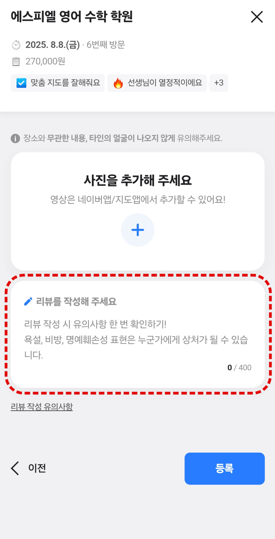 작성 완료된 리뷰 화면을 캡처(스크린샷)